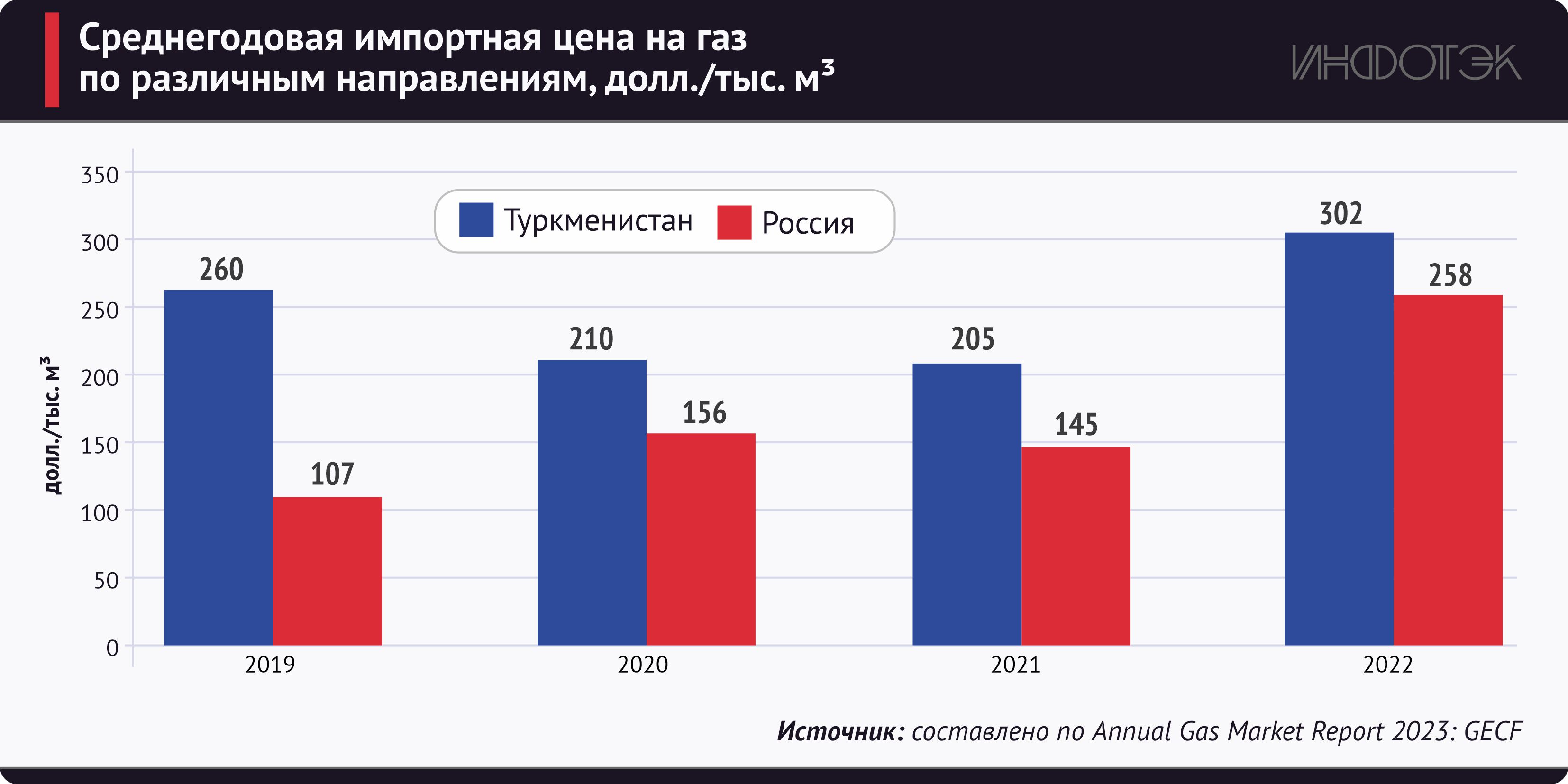 В 2022 году, по расчетам автора по данным Reuters и IHS Markit (входит в структуру S&P), средняя импортная цена на газ из России составила $258,1 за 1 тыс. куб. м, что на 14,5% ниже стоимости туркменского газа (см. рис. 3).
