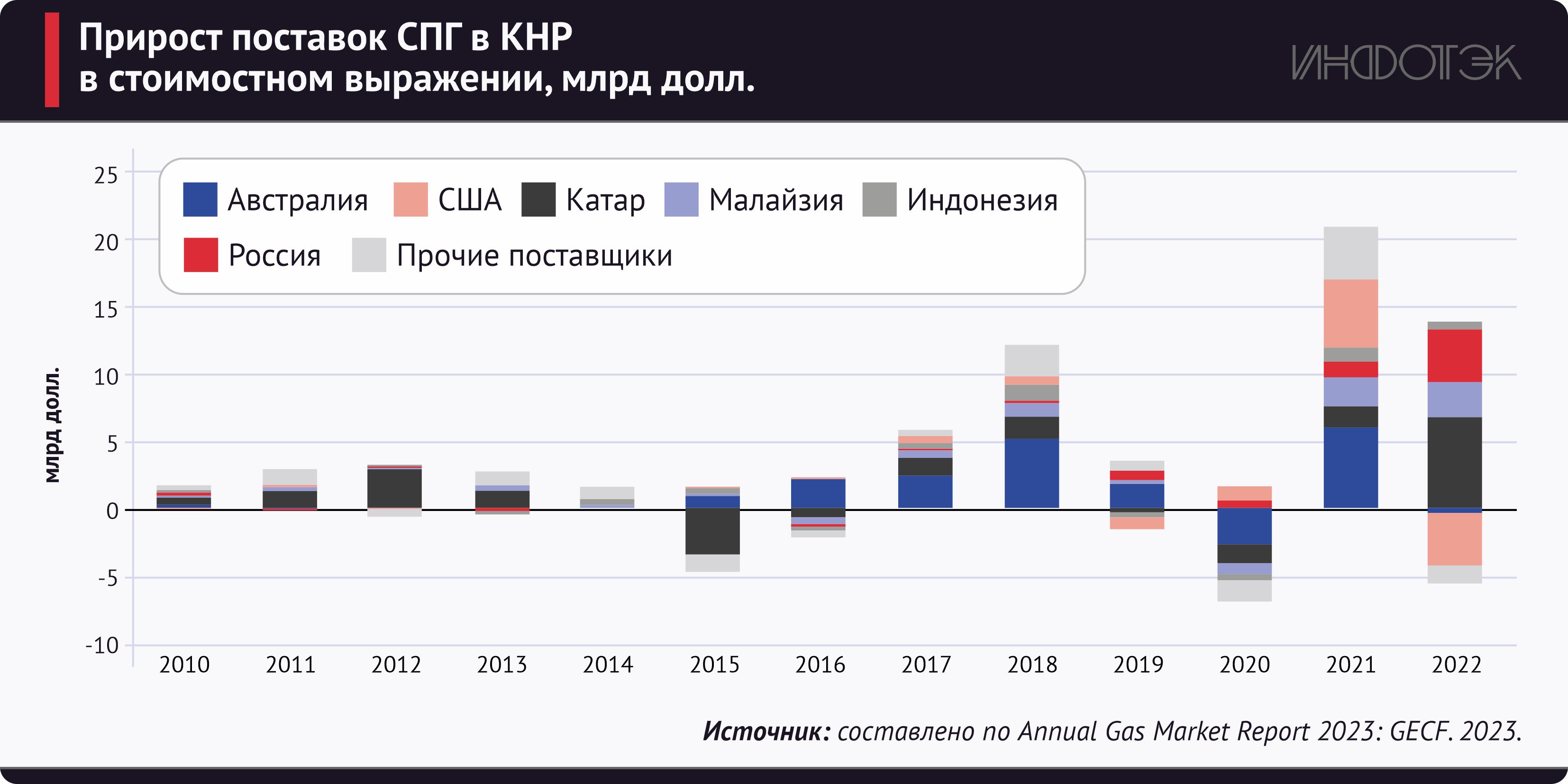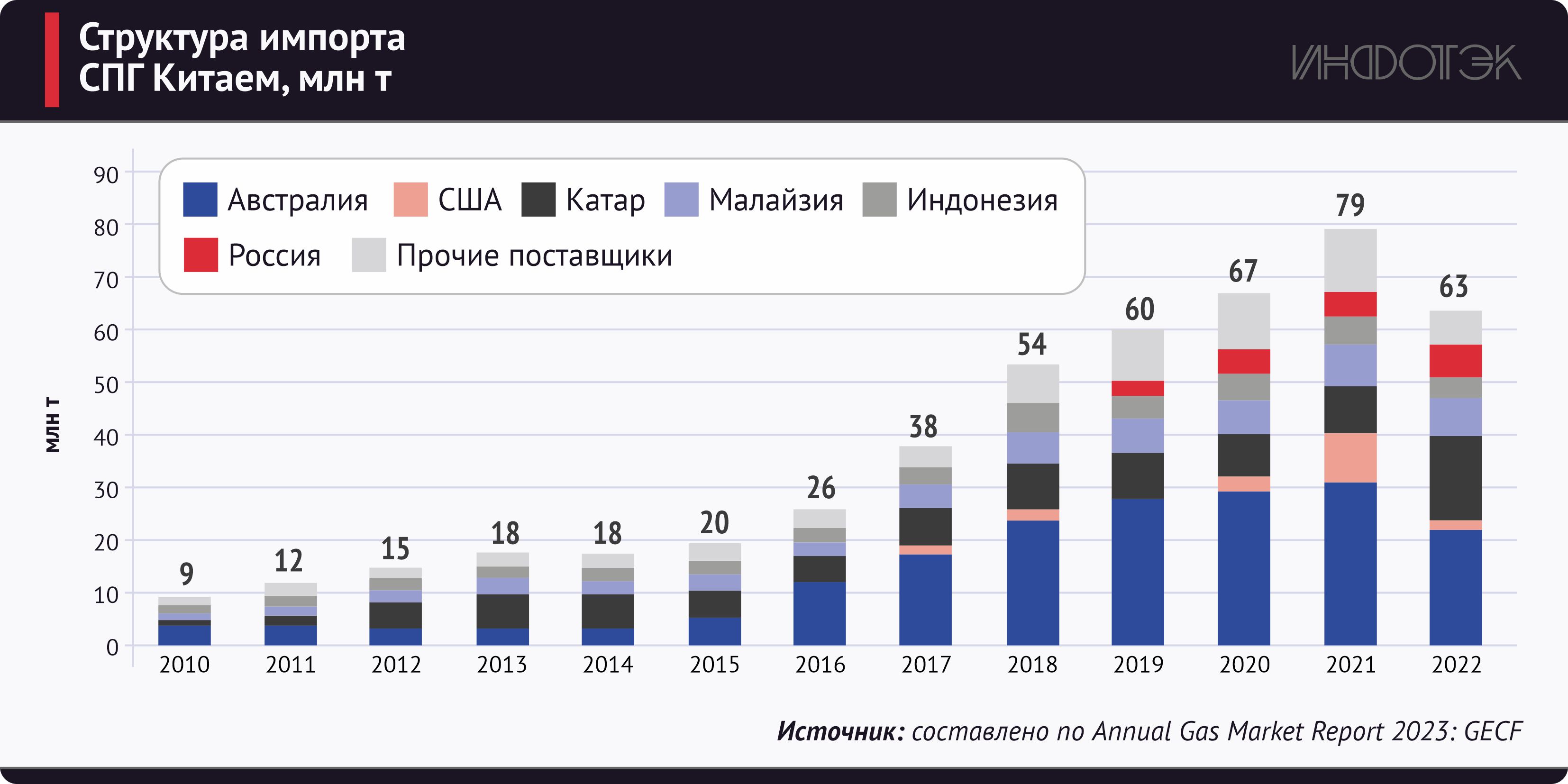 По оценке Energy Intelligence, в 2023 году поставки СПГ в Китай вырастут до 67,2 млн т. Оценка Международного энергетического агентства более оптимистична – 68–75 млн т в 2023 году. Ввоз СПГ по уже действующим контрактам составит, по данным Bloomberg и Форума стран – экспортеров газа, не менее 93,7 млн т в год к 2028 году. Крупнейшим экспортером СПГ в Китай останется Австралия, на втором месте – Катар. В дальнейшем, возможно, вырастет импорт из США, Малайзии и России.