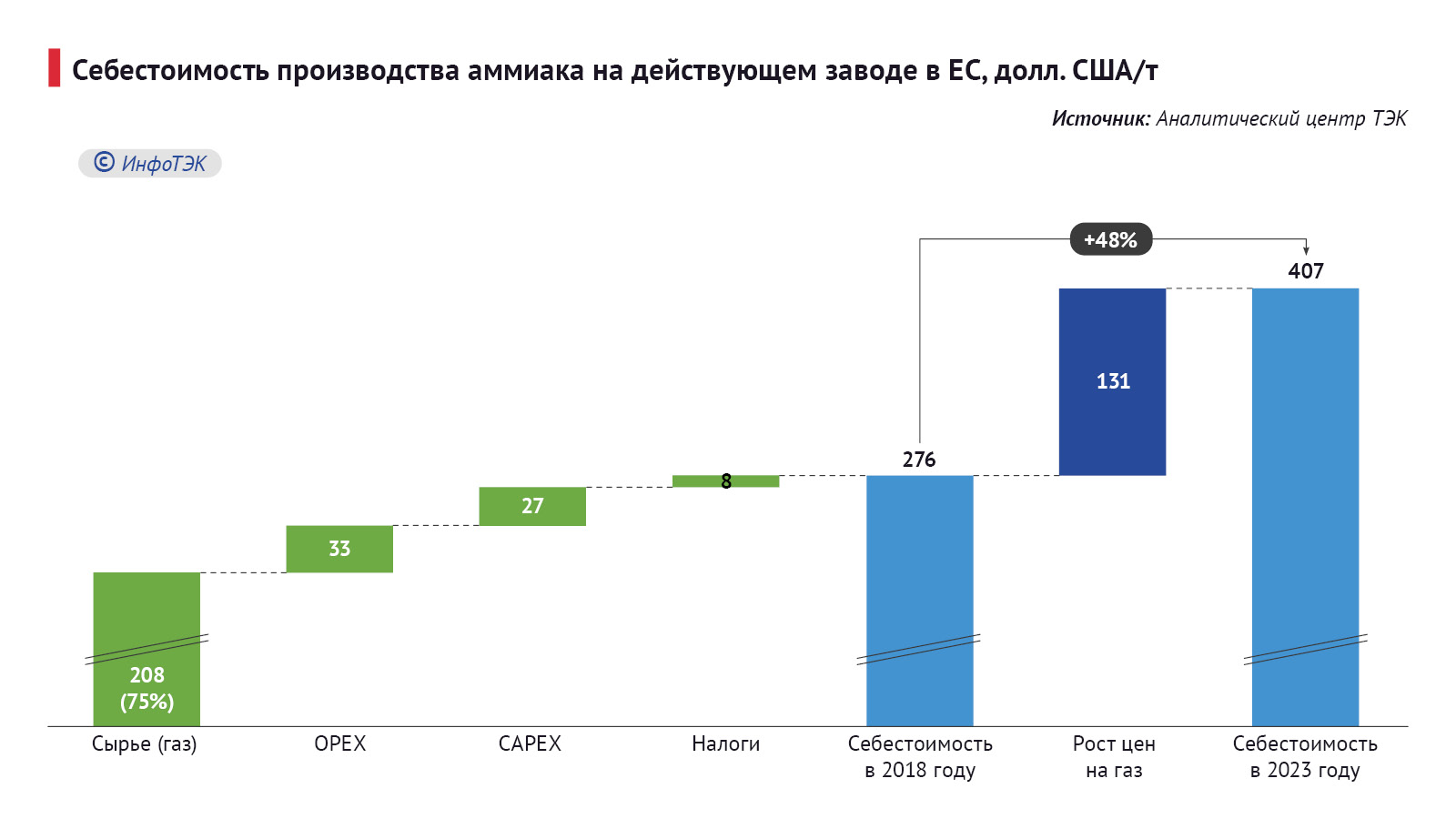 Помимо Yara последствия отказа от российского газа ощутил на себе немецкий гигант BASF, который объявил в 2023 году о закрытии одной из двух аммиачных линий мощностью 0,4 млн т на своем флагманском комплексе в Людвигсхафене. Американский гигант CF Industries был вынужден временно остановить производство аммиака в Великобритании, не выдержав возросших затрат на природный газ.
