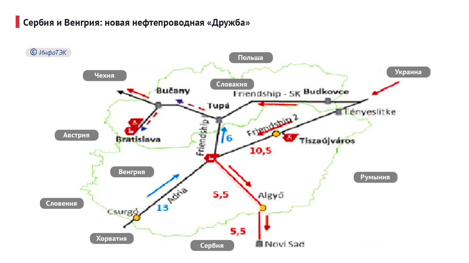 И тут, помимо речного и железнодорожного транспорта, на помощь опять спешит нефтепроводный проект. Идея Белграда и готового помочь ей Будапешта состоит в том, чтобы продлить до Сербии южную ветку нефтепровода «Дружба», снабжающего, по состоянию на конец 2025 года, российской нефтью Словакию и Венгрию. Говоря метафорически, действующая «Дружба» будет дополнена новой «нефтепроводной дружбой».