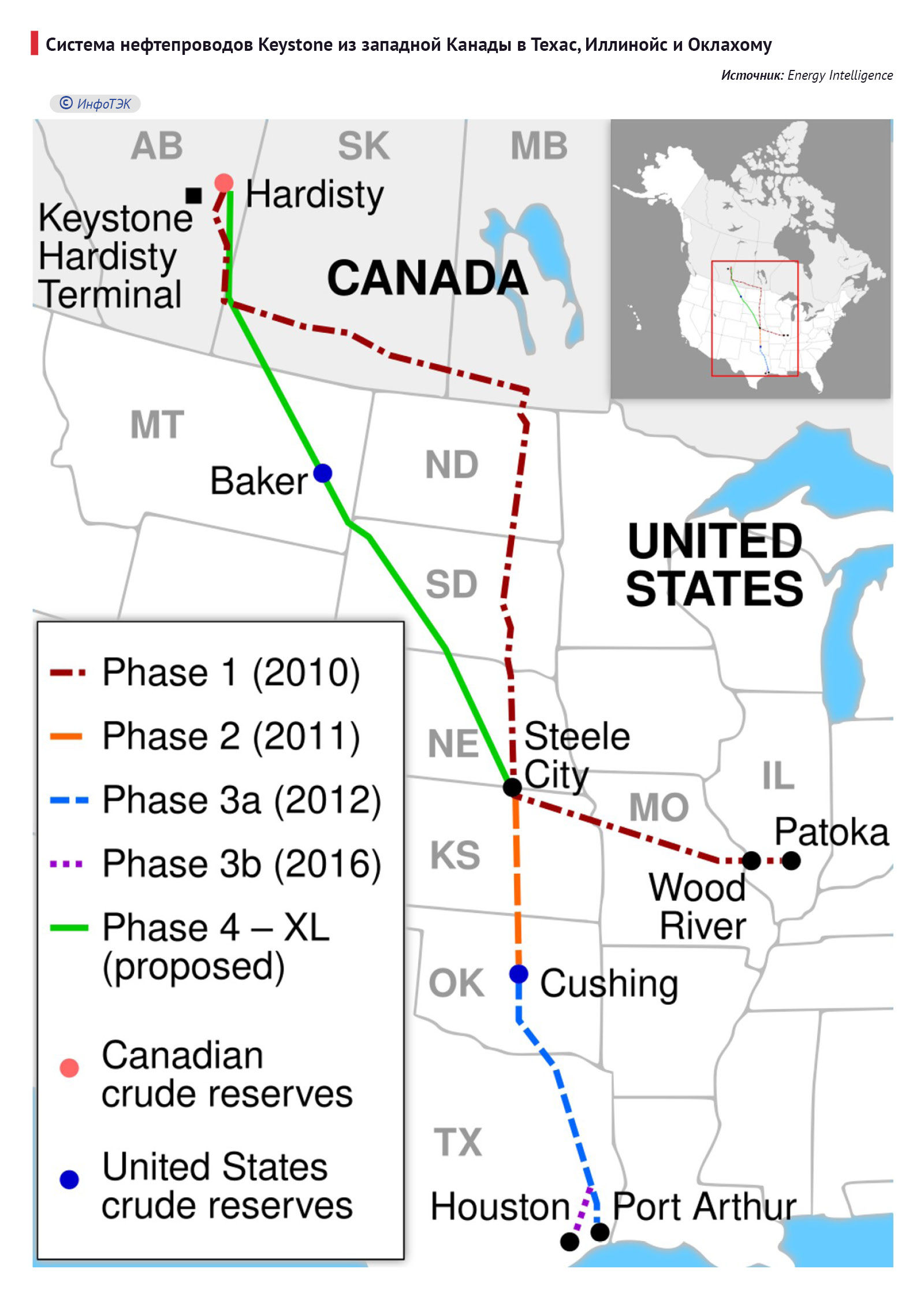Система нефтепроводов Keystone вводилась в строй постепенно, начиная с 2010 года. Keystone имеет протяженность 4 324 км. Пропускная мощность первых двух ниток на уровне 0,6 млн баррелей в сутки, третьей – 0,7 млн баррелей в сутки.
