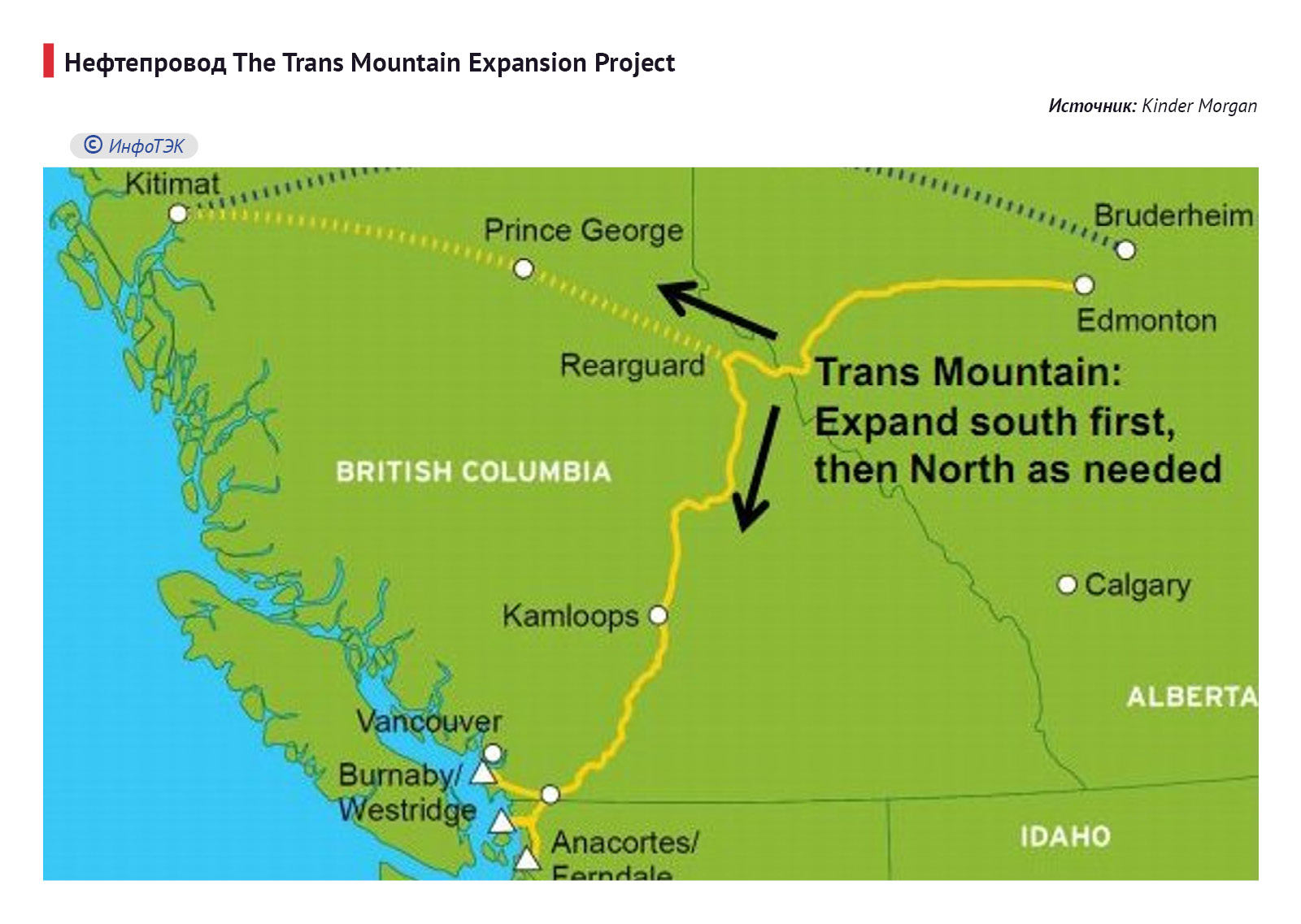 Trans Mountain pipeline – это система нефте- и нефтепродуктопроводов Канады, идущих от нефтяной провинции Альберта до тихоокеанского побережья провинции Британская Колумбия, протяженностью около 1150 км. Эта система трубопроводов, первые нитки которой были построены еще в 1950-е годы, дает Канаде возможность морского экспорта нефти через Тихий океан. Мощности трубопроводной системы начинались со «стартовых» 300 тыс. баррелей в сутки.
