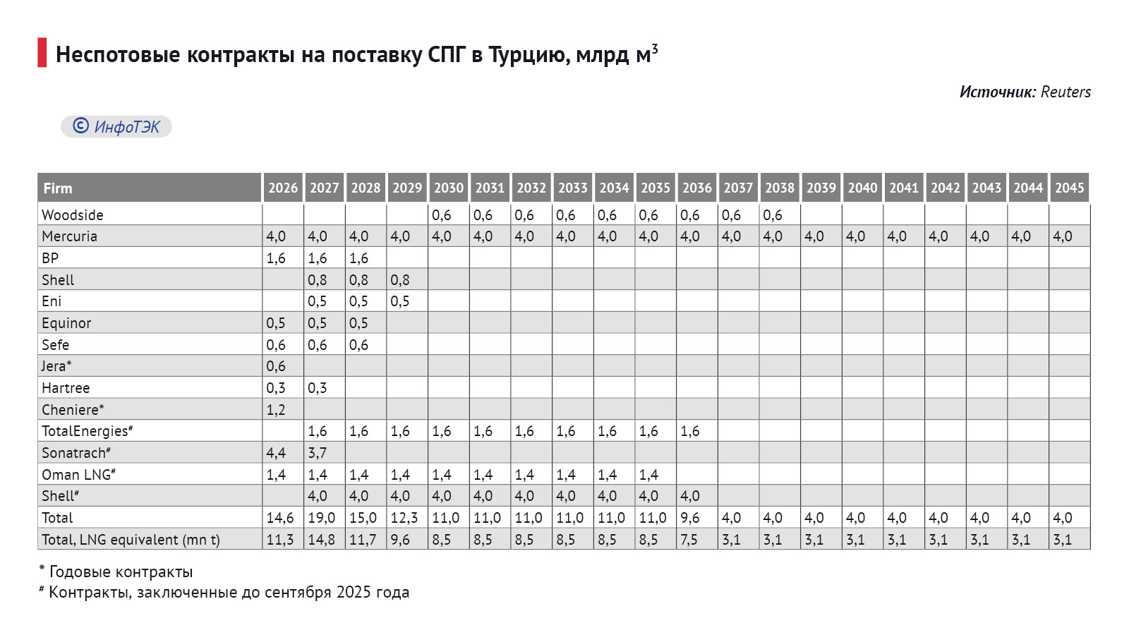 Баланса спроса и предложения на фоне роста его потребления складывается также благополучно для российского газа и 2027 и 2028 годах. Срок действия контракта с алжирским Sonatrach по СПГ истекает в октябре 2027 года. Для подстраховки от прекращения этого контракта Botaş в прошлом году заключила соглашение с Shell на поставку 4 млрд куб. м в СПГ год и соглашение с TotalEnergies на 1,6 млрд куб. м СПГ в год, которые начинают действовать с января 2027 года. И тот и другой контракт подписаны на условиях FOB, что открывает возможности для экспорта на рынки за пределами Турции, если для этого будут существовать рыночные условия.