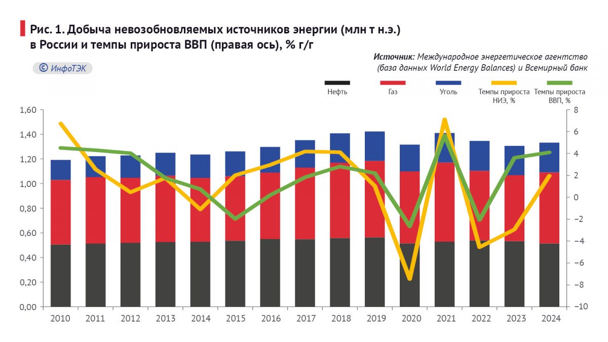 Развитие российской энергетики неразрывно связано с общей хозяйственной динамикой страны (Рис. 1). В связи с этим стратегия развития сырьевого комплекса является неотъемлемым элементом любой конструктивной экономической стратегии. Неслучайно до Специальной военной операции и уже после ее начала, прогнозы развития топливно-энергетического комплекса отличались оптимистичным взглядом, несмотря на внешние факторы, такие как террористические атаки на российские газопроводы, замедление темпов прироста ВВП, падающая добыча природного газа и кризис в угольной отрасли. При этом положительные взгляды нарастали год от года, достаточно взглянуть в «Энергетическую стратегию-2050» от 2025 г., не говоря уже о более ранних ее версиях.