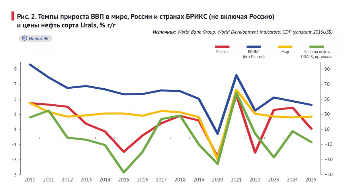 Что касается развития ТЭК, то с 2010 по 2024 гг. среднегодовые темпы прироста добычи невозобновляемых источников энергии (НИЭ) – нефть, природный газ и уголь – в России находились на уровне 0,8% (Рис. 2). В указанный промежуток времени выпуск основных сырьевых товаров в странах БРИКС превысил 2% в год, при этом более активно сырьевой сектор развивался в Китае, Индии и Индонезии.