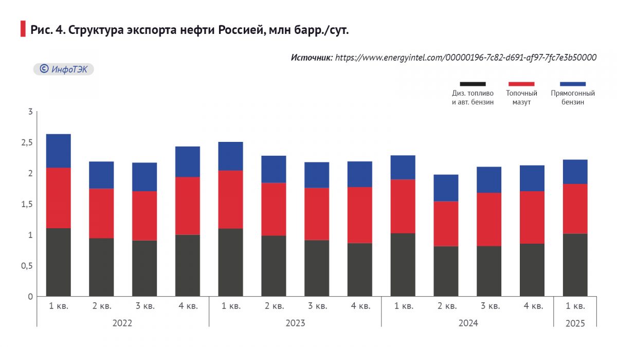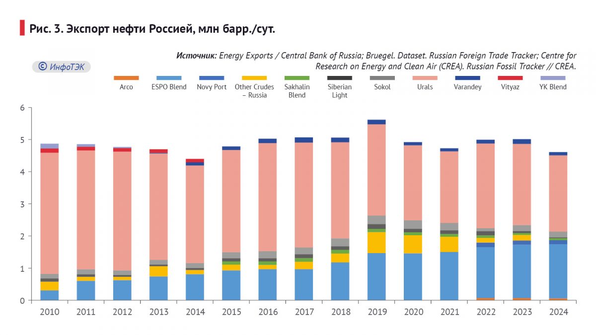 По жидким углеводородам ситуация более благоприятная, как в стоимостном, так и физическом выражениях. В указанный промежуток времени поставки нефти на экспорт в общем объеме сократились всего на 0,5 п.п. до 26,4%, тогда как в физическом выражении вывоз жидких углеводородов к концу 2024 г. уменьшился, по оценкам Energy Intelligence (Рис. 3), всего на 1,9% до 4,6 млн барр./сут., в результате сужения поставок нефти Urals на 28,3% – до 2,4 млн барр./сут.