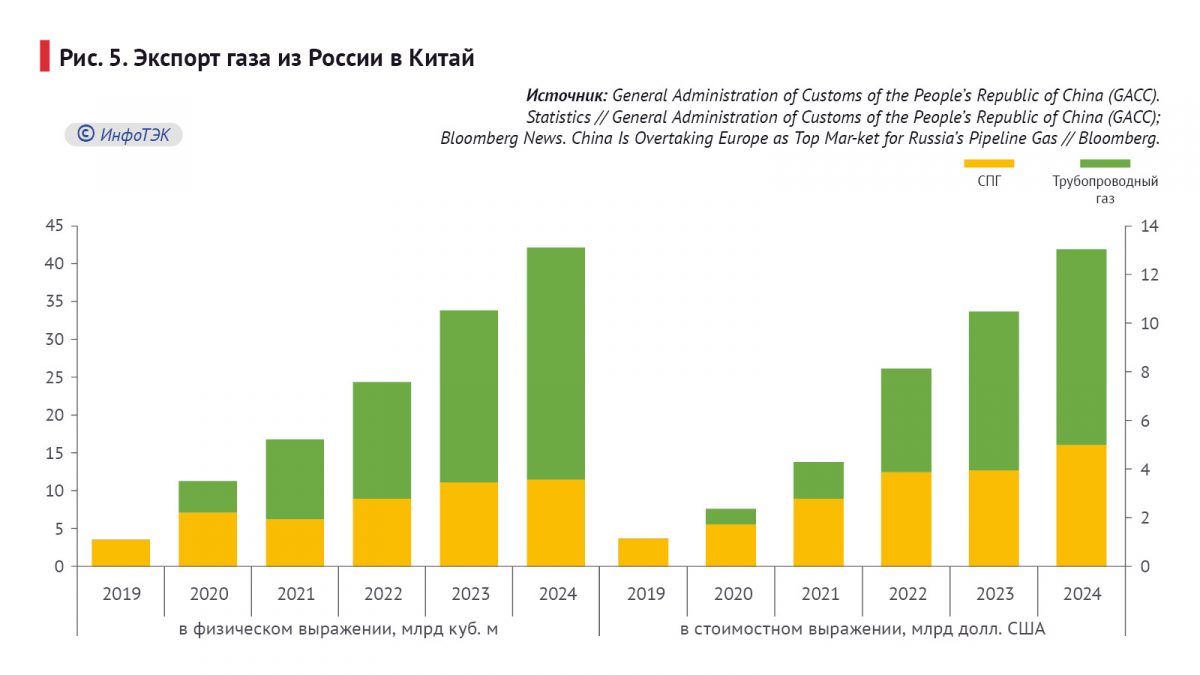 В физическом выражении экспорт газа в Китай (к уровню 2022 г.) вырос на 73,1% – до 42,1 млрд куб. м, из них трубопроводные поставки – в два раза (до 30,7 млрд куб. м). По данным «Газпрома», в 2024 г. поставки российского газа в КНР составили 31,1 млрд куб. м, что на 8,4 млрд куб. м больше, чем в 2023 г. Стоит отметить, что уже в 2025 г. трубопровод «Сила Сибири» вышел на проектную мощность (38 млрд куб. м), что позволяет нашей стране опередить Туркменистан по поставкам газа на китайском направлении (35,1 млрд куб. м). Суммарные поставки по «Силе Сибири» превысили плановые показатели и составили 38,8 млрд куб. м.