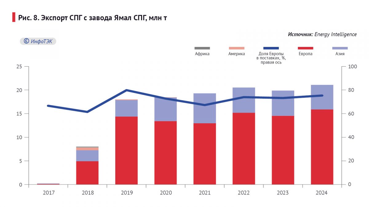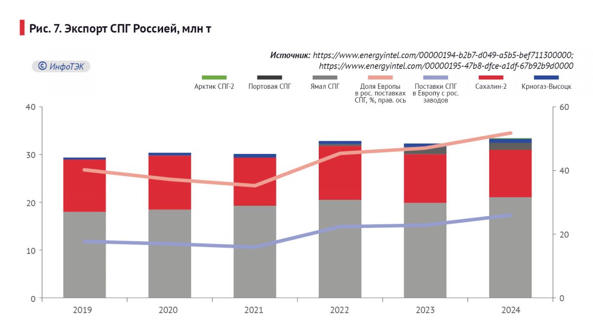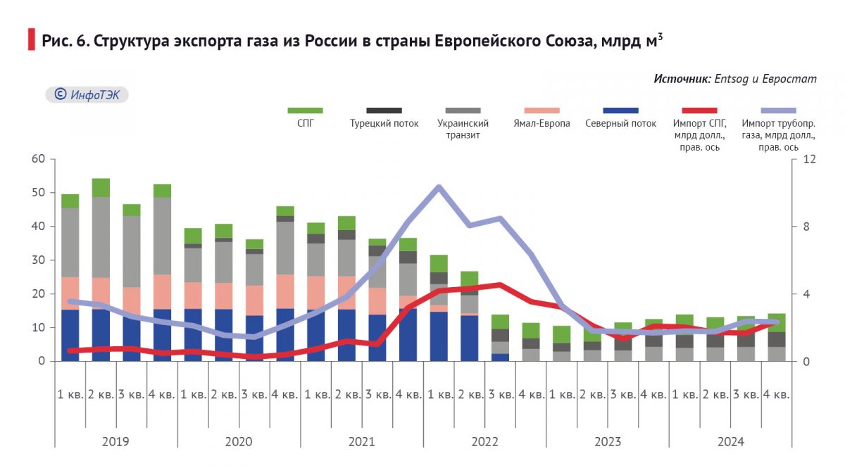 С 2021 по 2024 г. доходы РФ от экспорта трубопроводного газа в Европу сократились в 2,5 раза до 8,3 млрд долларов, в то же время увеличились продажи СПГ – в 1,3 раза, до 7,8 млрд долларов. При этом в последнее время отмечается тенденция превышения поступлений от вывоза СПГ, нежели трубопроводного газа.