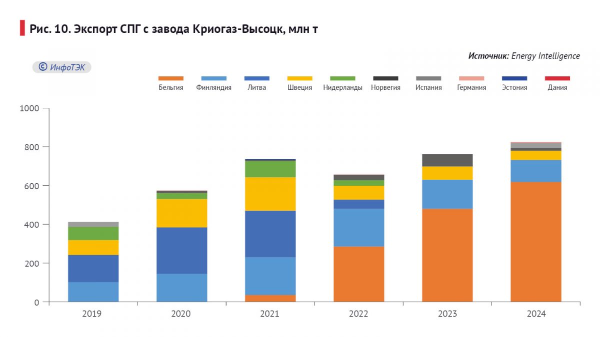 Доля европейских государств (в суммарных поставках российского СПГ) с указанных заводов в 2024 г. составила 76,1%, что на 9,7 п.п. выше уровня 2021 г. (Рис. 7), а в общем экспорте СПГ – 51,7% (+16,5 п.п.). При этом поставки СПГ с таких заводов как «Газпром СПГ Портовая» и Криогаз-Высоцк почти полностью приходились на европейский рынок (Рис. 8-Рис. 11). Так, по данным Energy Intelligence, в 2024 г. весь объем СПГ с Криогаз-Высоцк был направлен в Европу, в том числе Бельгию – 618,5 тыс. т; Портовой СПГ – 741,2 тыс. т, или 49,8% от общего выпуска СПГ заводом.