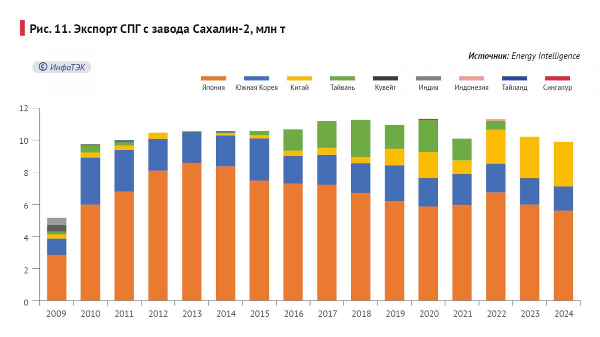 Единственный завод в России, который поставляет весь объем СПГ в Азию – «Сахалин-2». При этом большая часть направляется в Поднебесную (около 28%) и Японию (57%) в 2024 г. Таким образом, Россия может попасть в ловушку, которая заключается в том, что зависимость от одного-двух потребителей, способна вызвать сокращение производства. Учитывая, что в настоящее время на мировом рынке газа идет второй ренессанс СПГ, такой вариант вполне возможен.