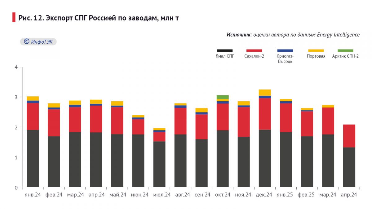 В 2024 г. администрацией бывшего президента США Дж. Байденом были введены санкции против российской СПГ-отрасли – под блокирующие рестрикции попали два завода («Газпром СПГ Портовая» и Криогаз-Высоцк), что отразилось на экспортных поставках нашей страны в начале 2025 г. В 1 кв. 2025 г. с указанных заводов было отгружено всего 0,33 млн т СПГ (Рис. 12), что почти в два раза ниже соответствующего периода 2024 г. С «Ямал СПГ», который формально не попал под блокирующие меры воздействия со стороны США и Евросоюза, но под них подпали три газовоза японского оператора Mitsui OSK Lines, также сократил вывоз газа на 9%, до 6,59 млн т. Наименее пострадавший завод от рестрикций – «Сахалин-2».