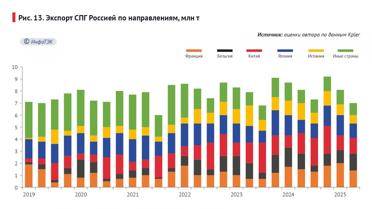 Наиболее диверсифицирован экспорт топлива с «Ямал СПГ». В Европу было отгружено 15,9 млн т, или 75,3% общего производства СПГ заводом, при этом основным покупателем выступали Франция, Испания и Бельгия. Стоит отметить, что до недавнего времени Франция была одним из ключевых покупателей российского трубопроводного газа, наряду с Германией и Италией.