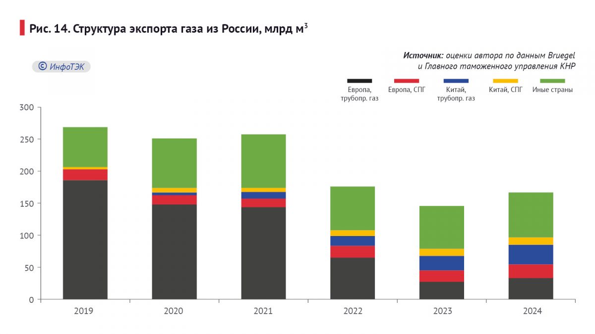В 2024 г. наша страна направила внешним потребителям около 166,2 млрд куб. м газа, что на 14,2% выше уровня 2023 г., в том числе трубопроводный – 100,9 млрд куб. м (+15%) и СПГ – 47,2 млрд куб. м (+6,1%). По оценкам Energy Institute, в 2024 г. экспорт увеличился на 10,4%, до 152,5 млрд куб. м.