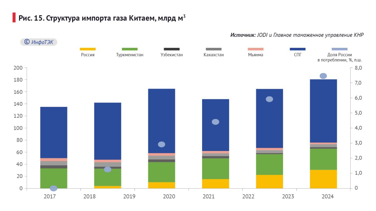 Подводя краткий итог, можно отметить, что удельный вес Поднебесной в поставках газа (с учетом СПГ) вырос на 18,1 п.п. до 25,1%, в том числе трубопроводных – с 4,1% до 18,4%, тогда как Евросоюза снизился на 14,7 п.п. – до 32,8%.