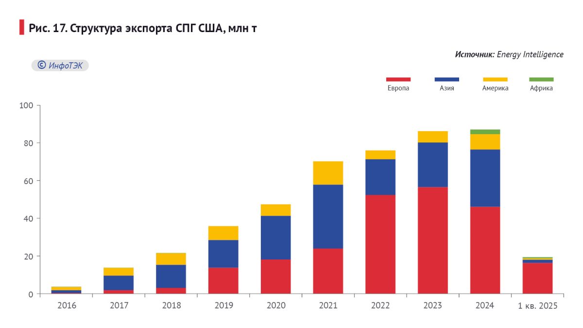 Что касается американского СПГ, за который так ратуют наши европейские партнеры, то с 2021 по 2025 г. доля Европы в американском экспорте сжиженного природного газа увеличилась на 49,8 п.п. до 84% (Рис. 17).