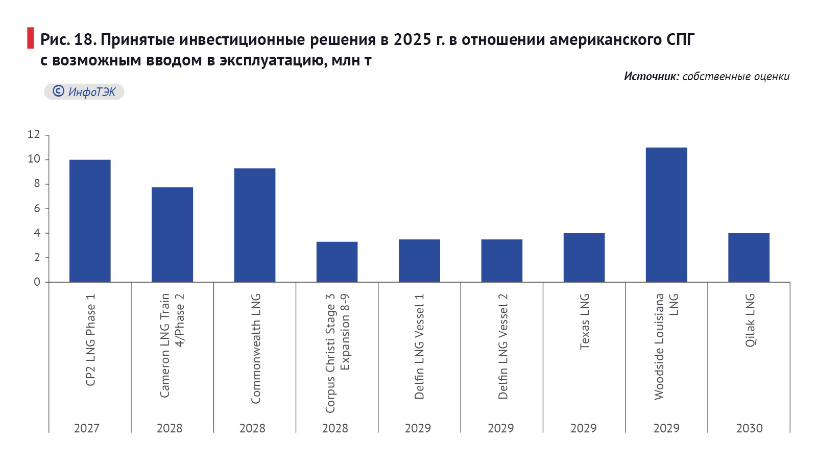 В 2025 г. было принято инвестиционное решение еще по некоторым СПГ-проектам (Рис. 18), в частности Delfin LNG, с вводом в эксплуатацию в 2027-2030 гг. Совокупная мощность заводов в Соединенных Штатах к 2030 году может составить 203 млн т, что примерно в 1,4 раза больше, чем у Катара.