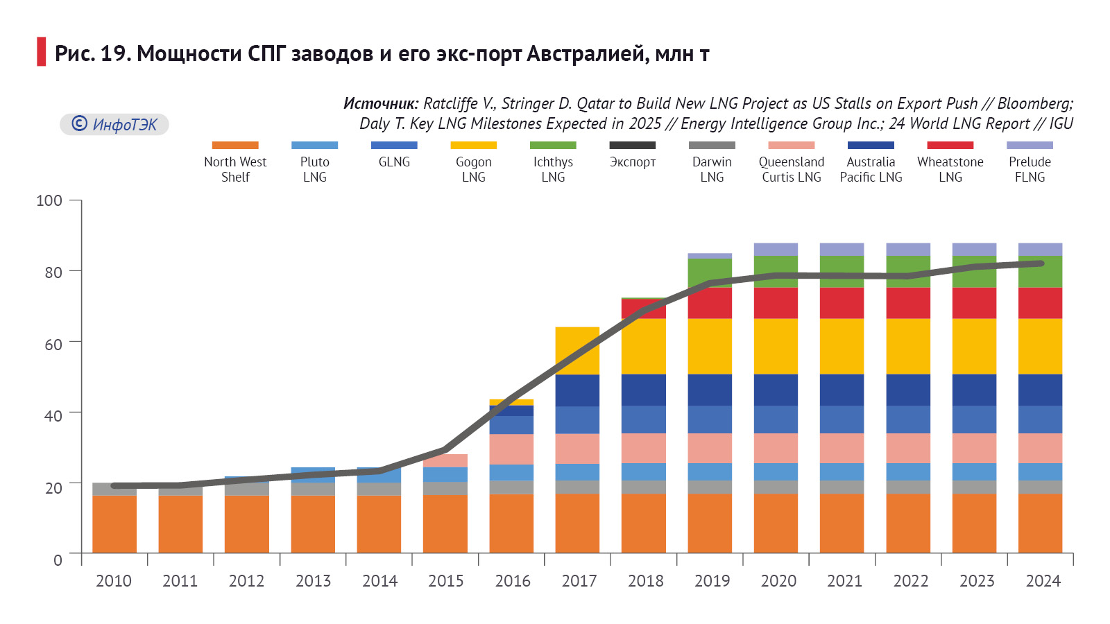 Примером уже в настоящее время может служить Австралия, которая обладает одним из самых больших в мире комплексом по производству СПГ – около 87,8 млн т. Но ресурсная база, качество запасов, а также высокая себестоимость сжижения газа не позволяют использовать их полностью, в отличие от России. В 2024 г. объем экспорта из Австралии (Рис. 19) составил 82 млн т, что на 0,9 млн т больше уровня 2023 г., тогда как в России (Рис. 20) мощности по производству СПГ – 35,9 млн т (с учетом первой линии «Арктик СПГ 2»), экспорт – 33,6 млн т, или 46,3 млрд куб. м. Стоит отметить, что увеличение вывоза СПГ из России наблюдалось со всех заводов, за исключением «Сахалина-2» (-0,5 млн т к уровню 2023 г., до 9,7 млн т), в том числе с «Арктик СПГ 2» – 0,1 млн т.