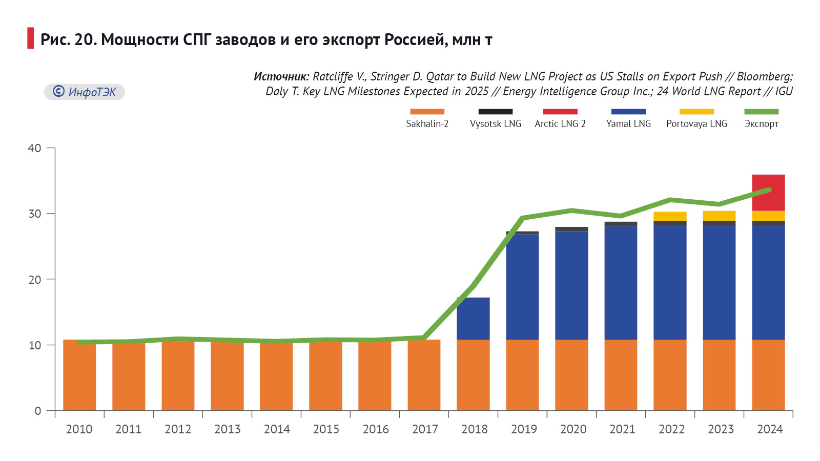 Согласно Долгосрочной программе развития производства сжиженного природного газа в Российской Федерации, утвержденной в марте 2021 г., производство СПГ должно достигнуть 100 млн т (около 124 млрд куб. м) к 2030 г. В этот документ включен 21 проект (в том числе по расширению действующих заводов), 17 из которых на конец 2024 г. оставалось нереализованными. В условиях санкционных ограничений на поставки СПГ-оборудования многие из них потеряли свою релевантность.