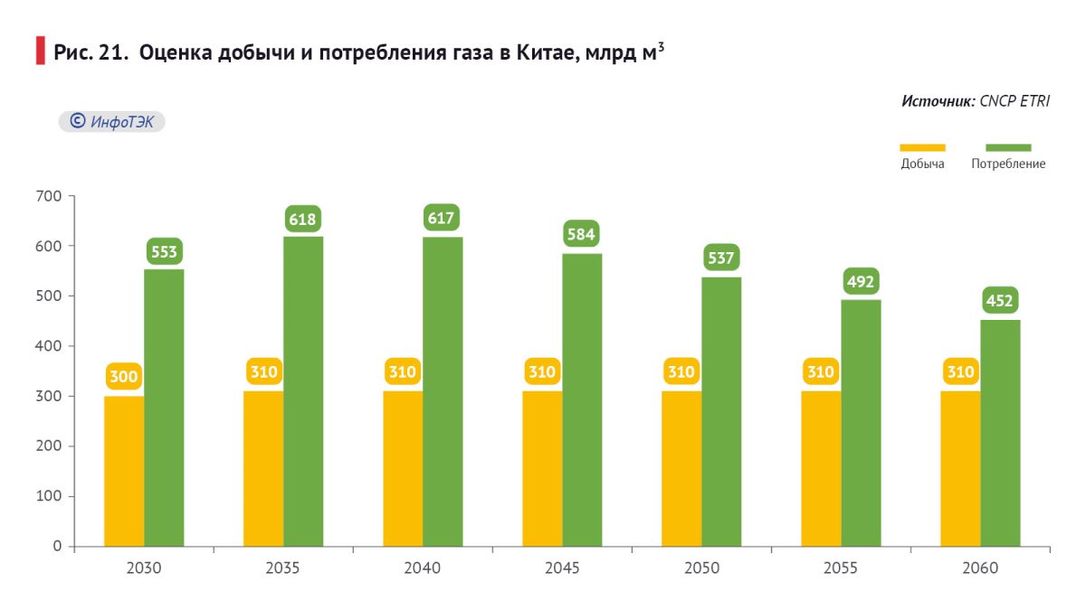 Российским газовым компаниям уже сейчас надо думать над расширением своего влияния в государствах Азии, чему будет способствовать план развития Северного морского пути. Тем более, по национальному прогнозу КНР, пик потребления газа придется на период 2030-2035 гг., далее – его снижение (Рис. 21). Таким образом, руководство Поднебесной может использовать российский газ как балансирующий, что явно не выгодно нашей стране.