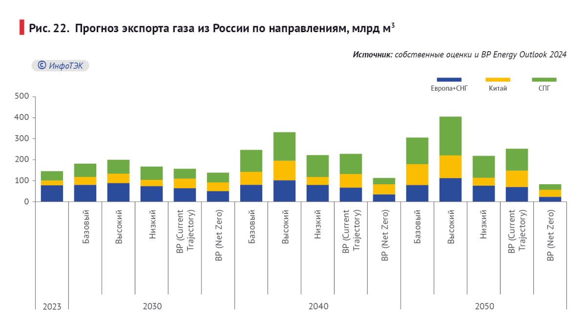Для сравнения оценок экспорта магистрального газа, в расчетах министерства энергетики РФ приводятся практически одинаковый уровень экспорта газа (в базовом сценарии) в 2050 г. – 176 млрд куб. м.
