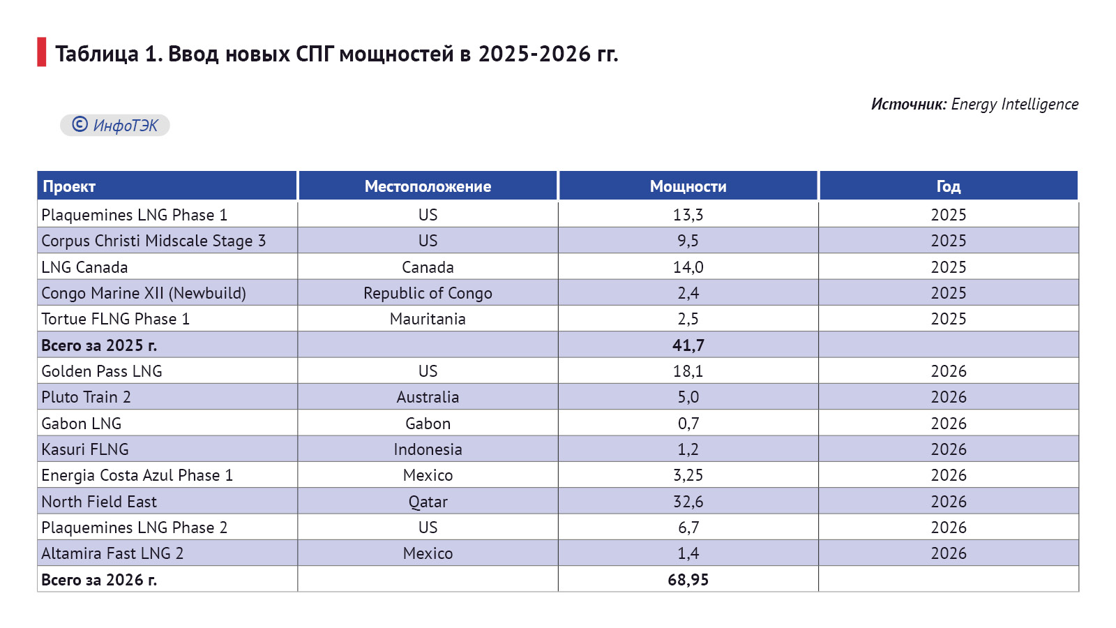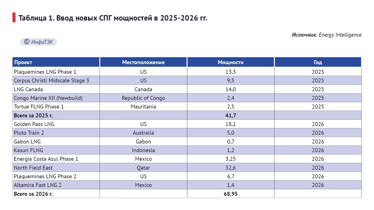 Ожидается, что два СПГ-предприятия выйдут на полную мощность к концу 2026 г. (Таблица 1), в частности завод Plaquemines LNG (мощность – около 20 млн т), а также Golden Pass LNG – 18,1 млн т.