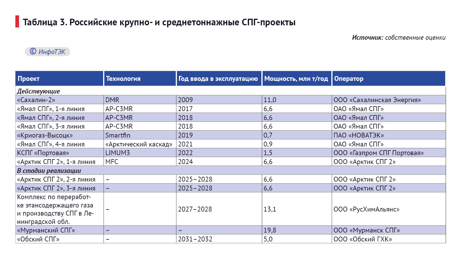 В таблице 3, составленной автором по результатам анализа открытых источников, представлены действующие и находящиеся в стадии реализации российские крупно- и среднетоннажные СПГ-проекты.