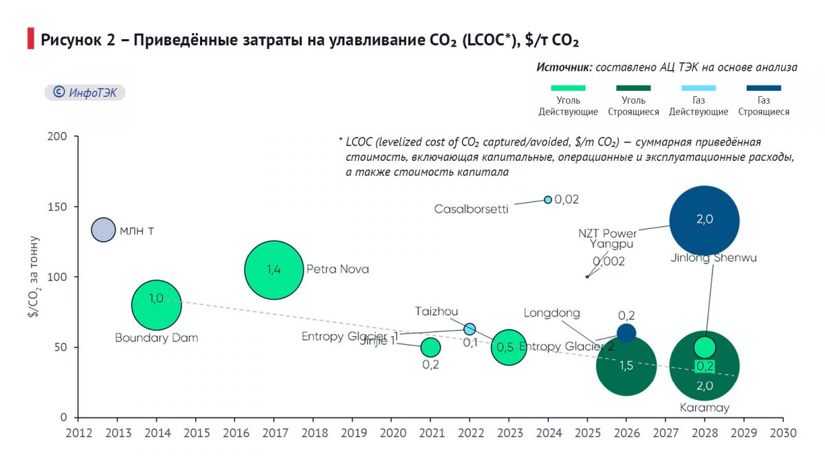Наиболее масштабным газовым CCS-проектом является британский NZT Power мощностью 2 млн т в год, планируемый на 2029 год. Однако стоимость его высока – $130-150 за тонну CO₂. И она обусловлена инновационностью технологии и затратами на инфраструктуру.