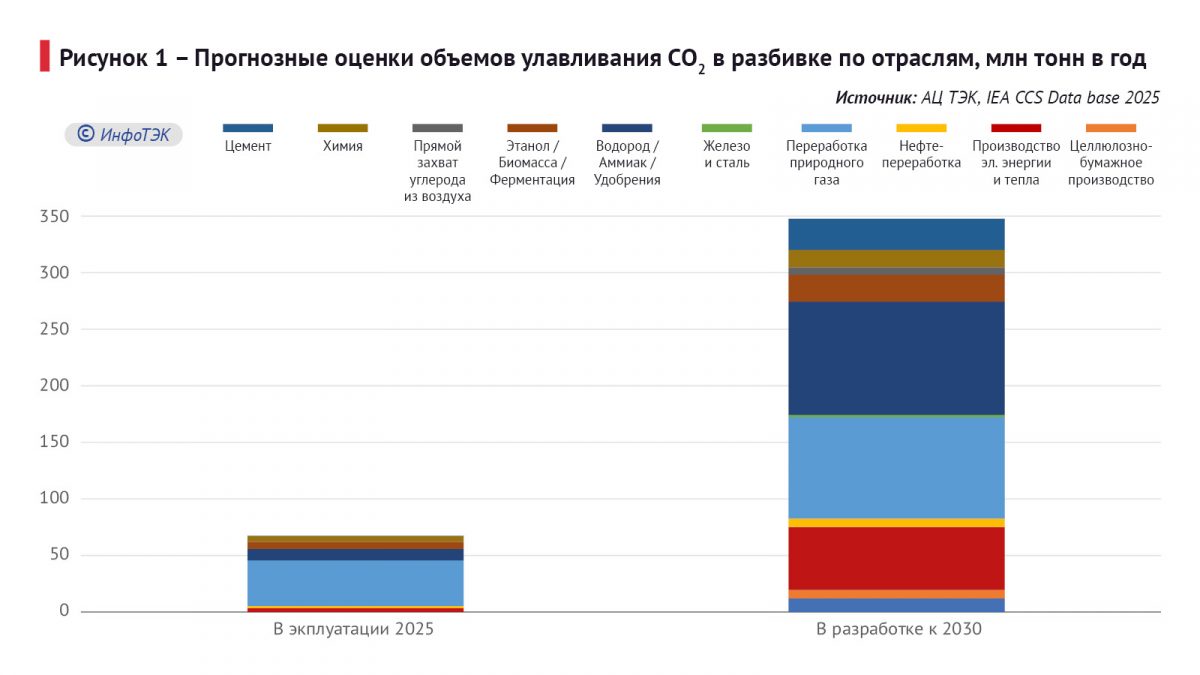 Согласно прогнозам, глобальный портфель проектов улавливания углекислого газа к 2030 году достигнет около 350 млн тонн CO₂ в год. При этом генерация электроэнергии и тепла не будет играть в нем доминирующую роль, составляя около 16% (56 млн тонн CO₂ в год). (Рисунок 1). Применение CCS на угольных станциях прогнозируется больше, чем на газовых – 3,5 и 2,16 млн тонн соответственно.