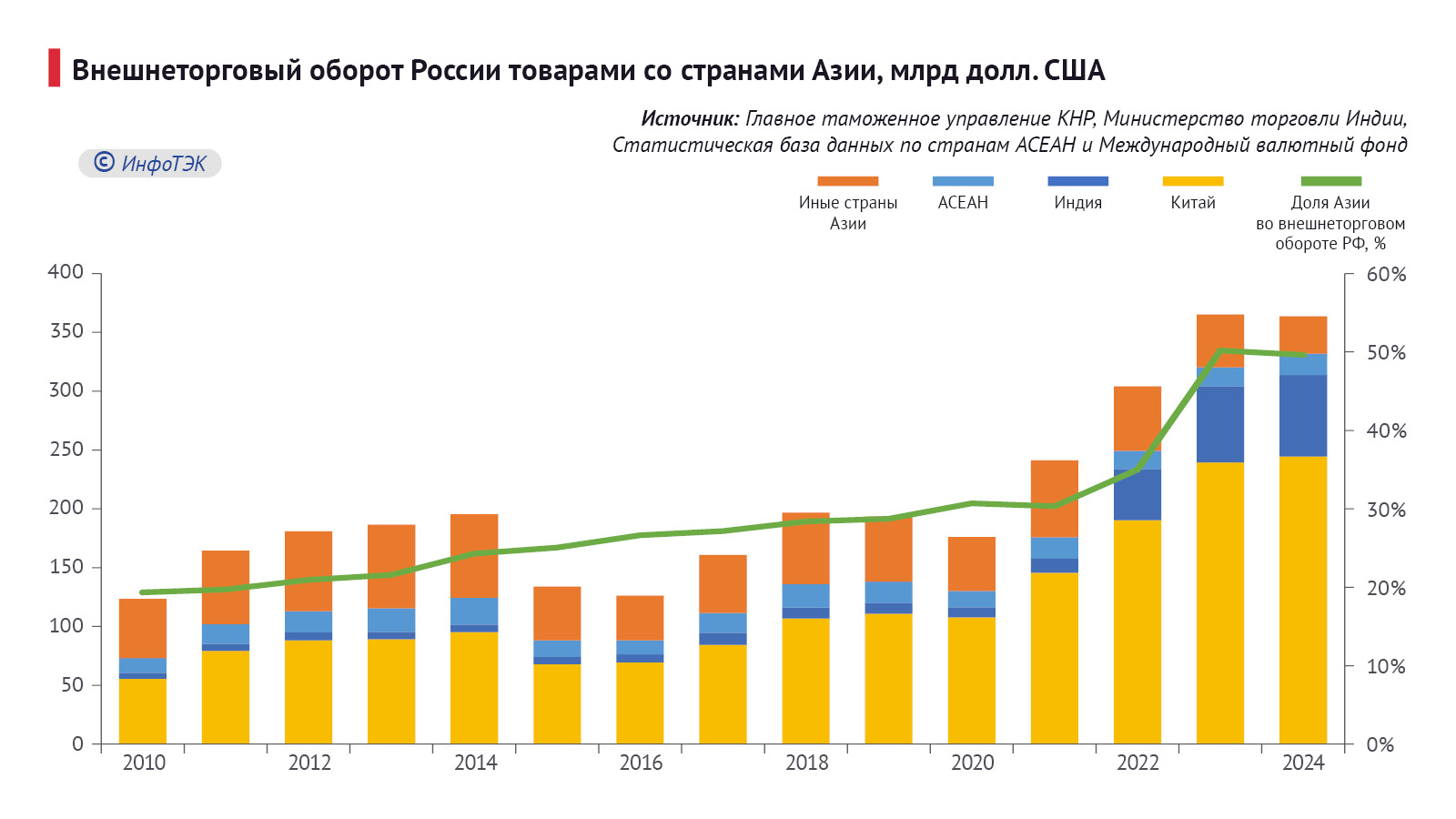 Особенно активно двухсторонние отношения принялись развиваться после начала специальной военной операции и переориентацией российского рынка на АТР. Так, с 2021 г. по 2024 г. экспорт возрос в 1,67 раза, а импорт – 1,29 раза. Накопленные продажи в Азию с 2010 г. составили около $1,9 трлн, в том числе после начала масштабных санкций 2022 г. – $0,7 трлн, или 36,0% от общей отгрузки из РФ.