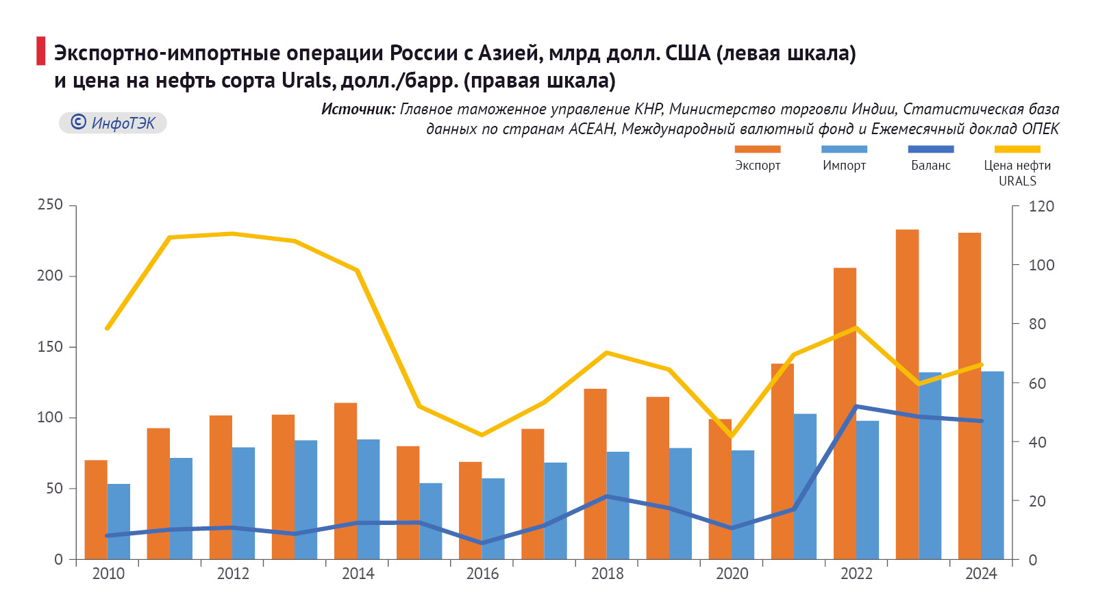 При этом важно отметить, что экспорт снижался в периоды падения цен на нефть Urals, исключением стали 2023-2024 гг. К концу 2024 г. экспорт несмотря на повышение стоимости жидких углеводородов снизился на $2,3 млрд. – до $230,7 млрд., в результате морских инфраструктурных ограничений в области поставок нефти и нефтепродуктов на рынок АТР.