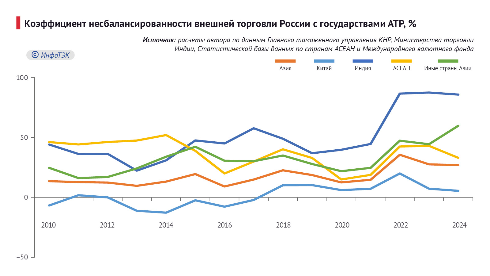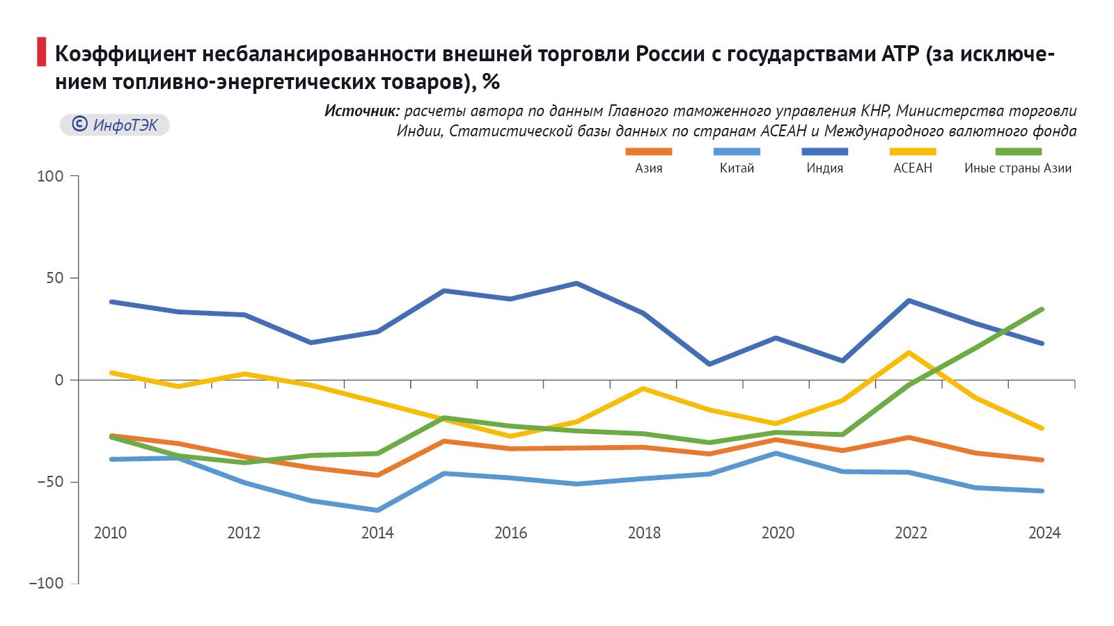 Общее положительное сальдо для России в торговле с АТР увеличилось в 5,8 раза (к уровню 2010 г.) – до $97,9 млрд., коэффициент несбалансированности товарооборота (отношение чистого сальдо к обороту) в пользу России составил 26,9% (Рис. 3), что на 13,3 п.п. выше уровня 2010 г., с Китаем – 5,5%, Индией – 85,8%, государствами АСЕАН – 33,1%, иными странами Азии – 59,7%. Если из товарного экспорта России убрать топливно-энергетическую продукцию (код ТН ВЭД 27), то указанный коэффициент примет вид: для Азии в целом – минус 39,1%, для Китая – минус 54,3% и для АСЕАН – минус 23,6% (Рис. 4).