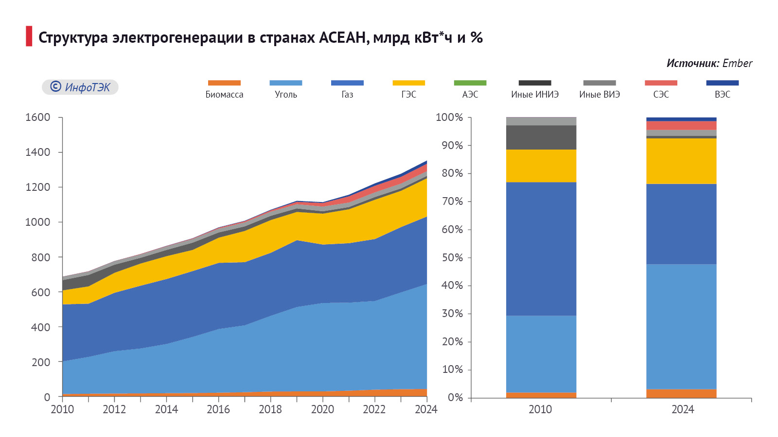 Экспорт угля из России в страны АСЕАН вырос с 8 млн долл. до 2,1 млрд долл., чему способствовало расширение использования угля в электрогенерации и уменьшение зависимости от импорта газа в отдельных странах. Так, по оценкам специалистов Ember, с 2010 по 2024 г. спрос на твердое топливо в потреблении электроэнергии в АСЕАН повысился в 3,2 раза (до 602 млрд кВт*ч), а доля – на 17,2 п.п., до 44,5% (Рис. 5). При этом удельный вес природного газа сократился на 19 п.п. – до 28,7%.