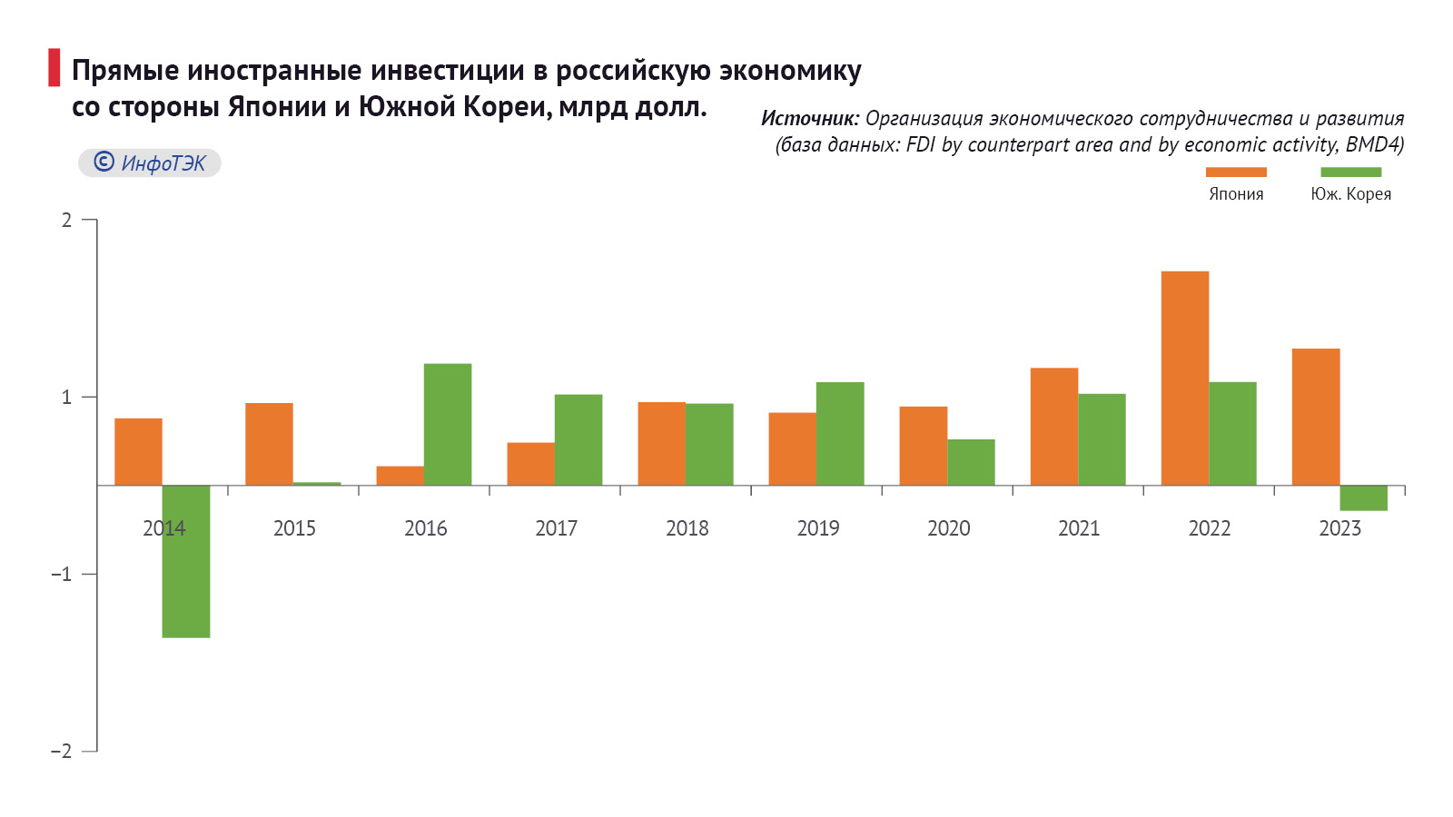 Несмотря на санкции и внешние попытки воздействия на японские компании, они остаются наиболее стабильными инвесторами в РФ после КНР. Чего нельзя сказать о корейских партнерах, за исключением проектов в топливно-энергетическом комплексе. В 2023 г. совокупные корейские инвестиции в российскую экономику сократились на $2,95 млрд – до $2,2 млрд.