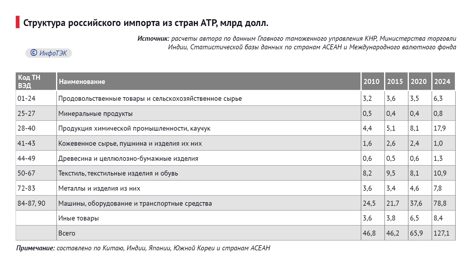 В российском экспорте в Азиатско-Тихоокеанский регион доминируют сырьевые товары (в основном нефть и уголь, в меньшей степени природный газ) и продукция низкого передала. В товарной структуре российского вывоза продукции в страны АТР не наблюдается трансформации (Таблица 1). Удельный вес топливно-энергетических товаров составляет около 60,9%, что на 2,7 п.п. выше уровня 2010 г. (учитываются Китай, Индия, Япония, Южная Корея и АСЕАН – на них в 2024 г. приходилось около 94,5% российского экспорта в страны Азии и 73,7% импорта). Причем доля сырой нефти неуклонно увеличивается – с 33,2% до 52,5%.