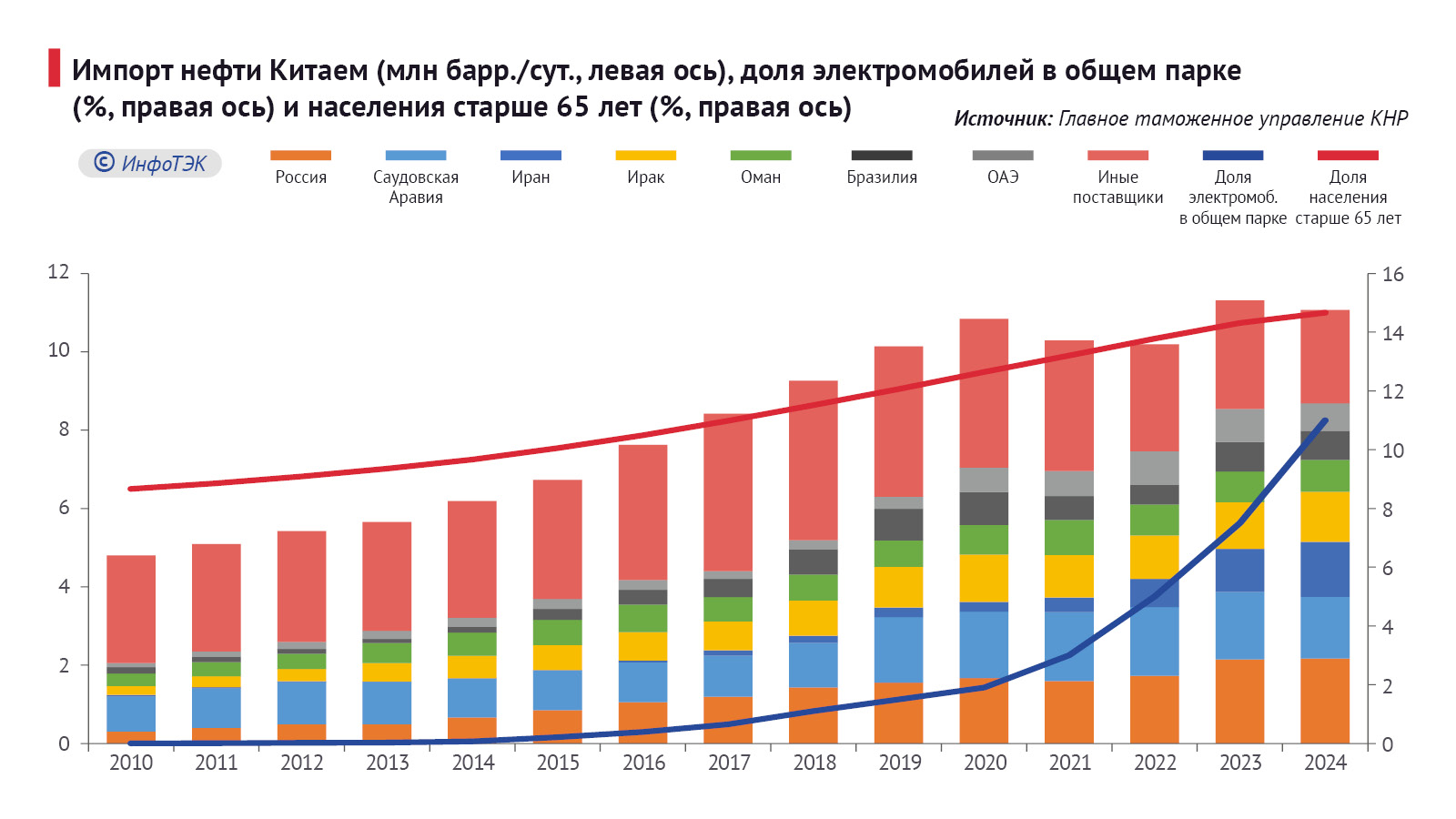 Еще в 2009 г. между двумя странами было заключено соглашение о сотрудничестве в нефтяной сфере. Россия является одним из крупнейших поставщиком нефти в Китай. В 2024 г. ее доля, по данным Главного таможенного управления КНР, составила 19,6% (Саудовской Аравии – 14,2%). За этот период импорт нефти из РФ превысил 2,2 млн барр./сут., что на 35,8% выше уровня 2021 г. При этом 37% сырья (около 0,8 млн барр./сут.) были поставлены в рамках долгосрочных контрактов между ПАО «НК «Роснефть» с Китайской национальной нефтегазовой корпорацией (КННК).