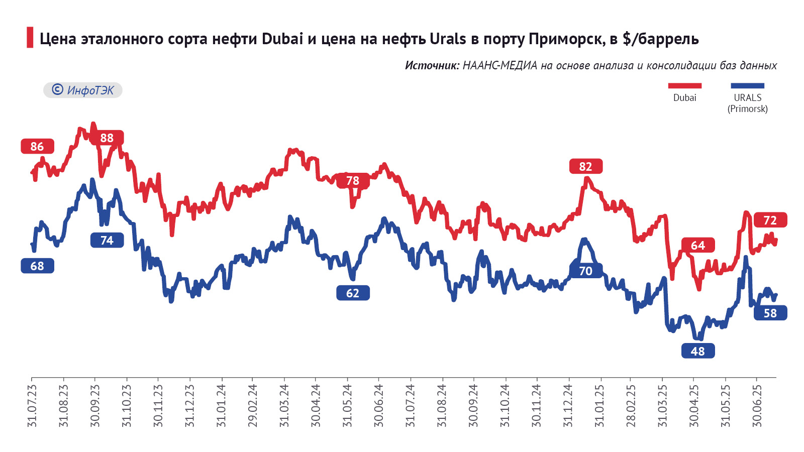 Цена эталонного сорта ближневосточного сорта нефти Dubai, являющегося ориентиром цены для рынка Азиатско-Тихоокеанского региона (АТР), и цена на нефть Urals в порту Приморск, начиная с 2022 года, имела значимый разрыв и колебалась от 8% до 34%.