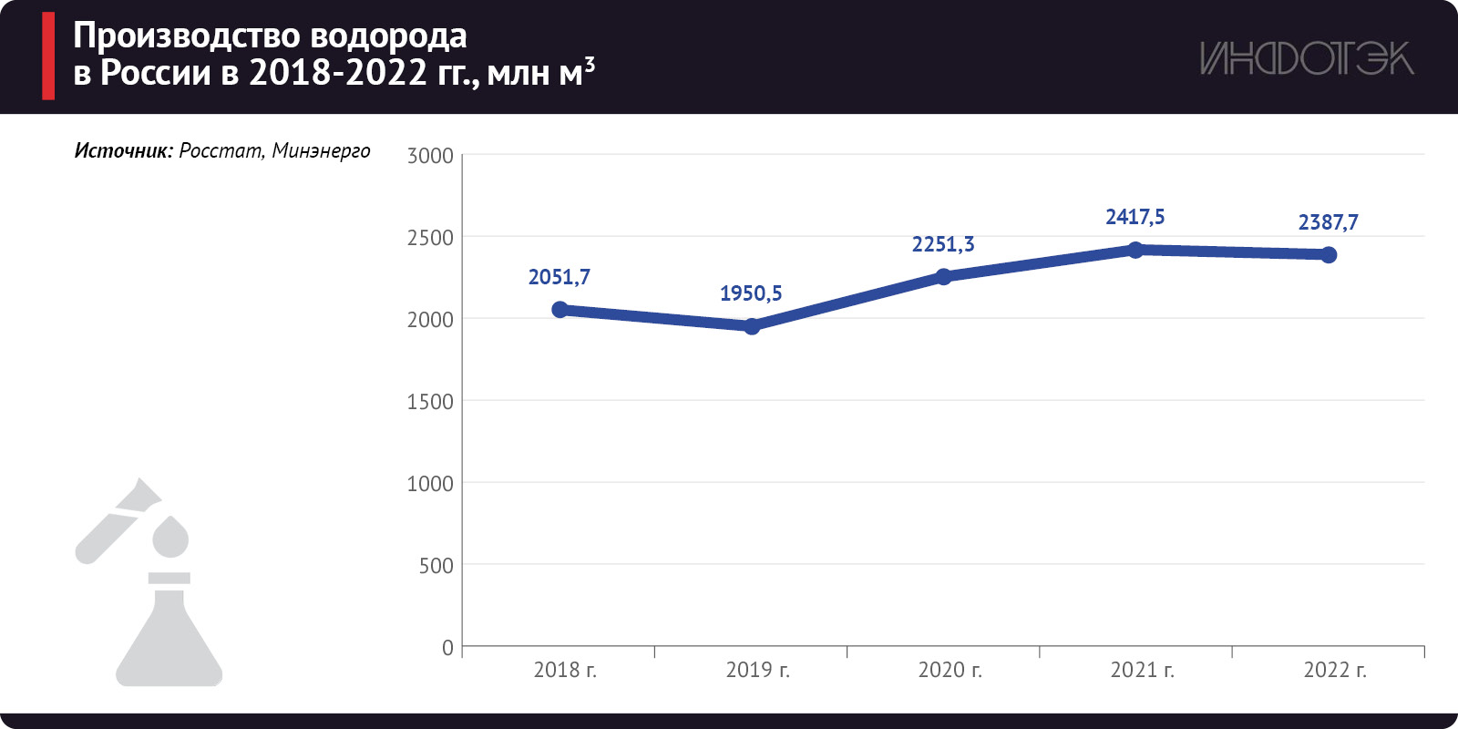 Доля России в глобальном производстве водорода сегодня составляет около 7%, страна занимает пятое место в мире после Китая, США, ЕС и Индии. С 2018 по 2022 год производство водорода в России увеличилось на 16,6%: с 2,05 до 2,39 млрд куб. м. Однако по сравнению с 2021 годом оно снизилось на 1,2% (см. рис. 1).