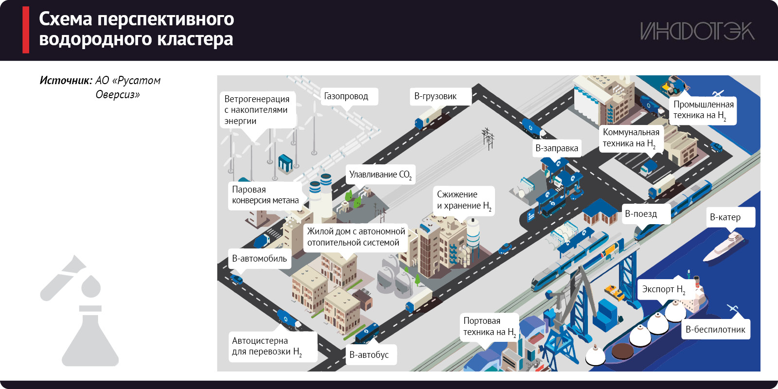 Крупнейшие кластеры по производству водорода создаются на Сахалине (проект «Росатома» по транспортировке «голубого» водорода морем в Китай), в Якутии (проект «Северо-восточного альянса» по поставке «голубого» водорода в КНР по железной дороге), на Ямале (проект «Новатэка» по экспорту «голубого» водорода морем в Германию), в Восточной Сибири (поставки En+ «зеленого» водорода в Китай по железной дороге) и на Северо-Западе (проекты «зеленого» водорода «Росатома», «Роснано», «H2 Чистая энергетика»).