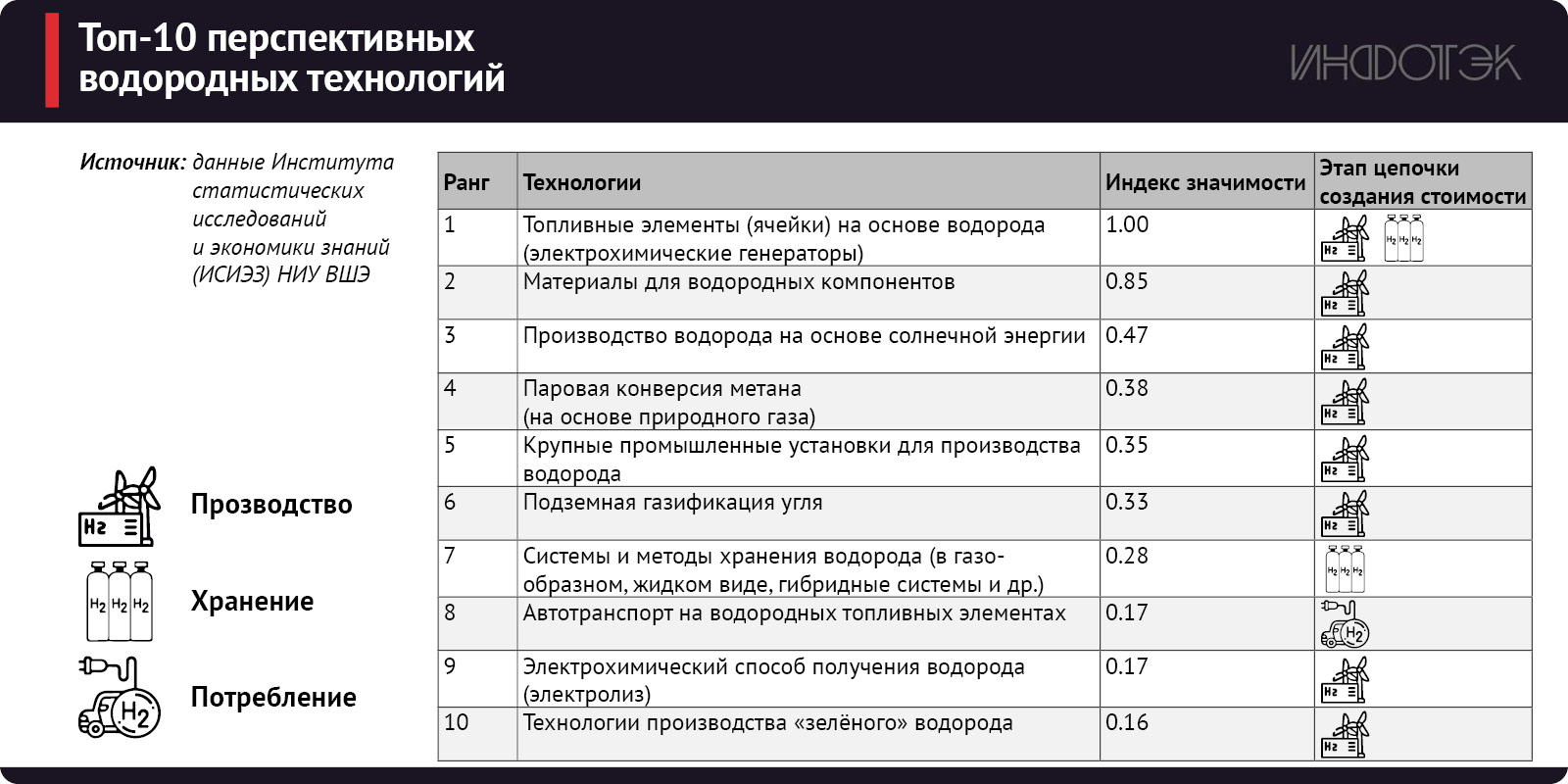Сегодня водород рассматривается как перспективный энергоноситель, способный обеспечить надежное получение доступной и экологичной энергии. Поэтому в последние десятилетия в мире разработано большое число новых технологий в области производства, хранения и транспортировки водорода (см. таблицу).